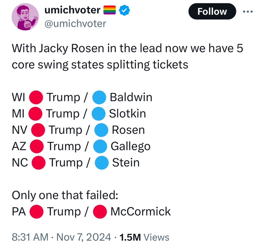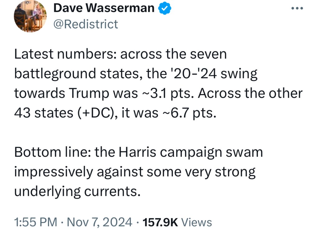 2024 is also nothing remotely like a landslide election like those in 2008, 2010, or 2018. Republicans this year had a wide open field of vulnerable Democratic senators to pick off in battleground states that Trump won, but only won a single one. If Democrats’ brand was so unbelievably toxic, how did that happen?: