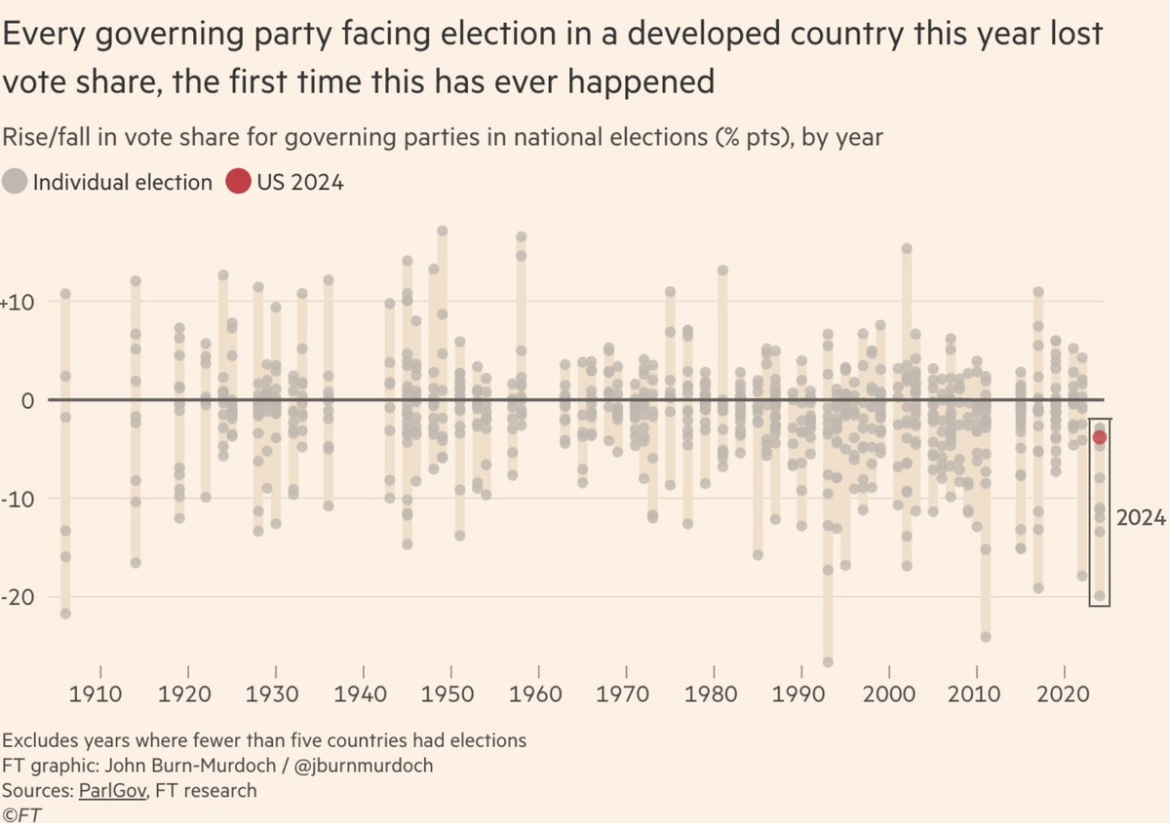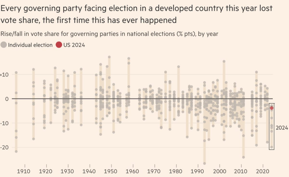 The world also ran a fun experiment when it had a pandemic in 2020, with all of its fallout, followed by inflation. For the first time in a hundred years, every developed country that had an election this year had its incumbent party get beat, often quite badly: